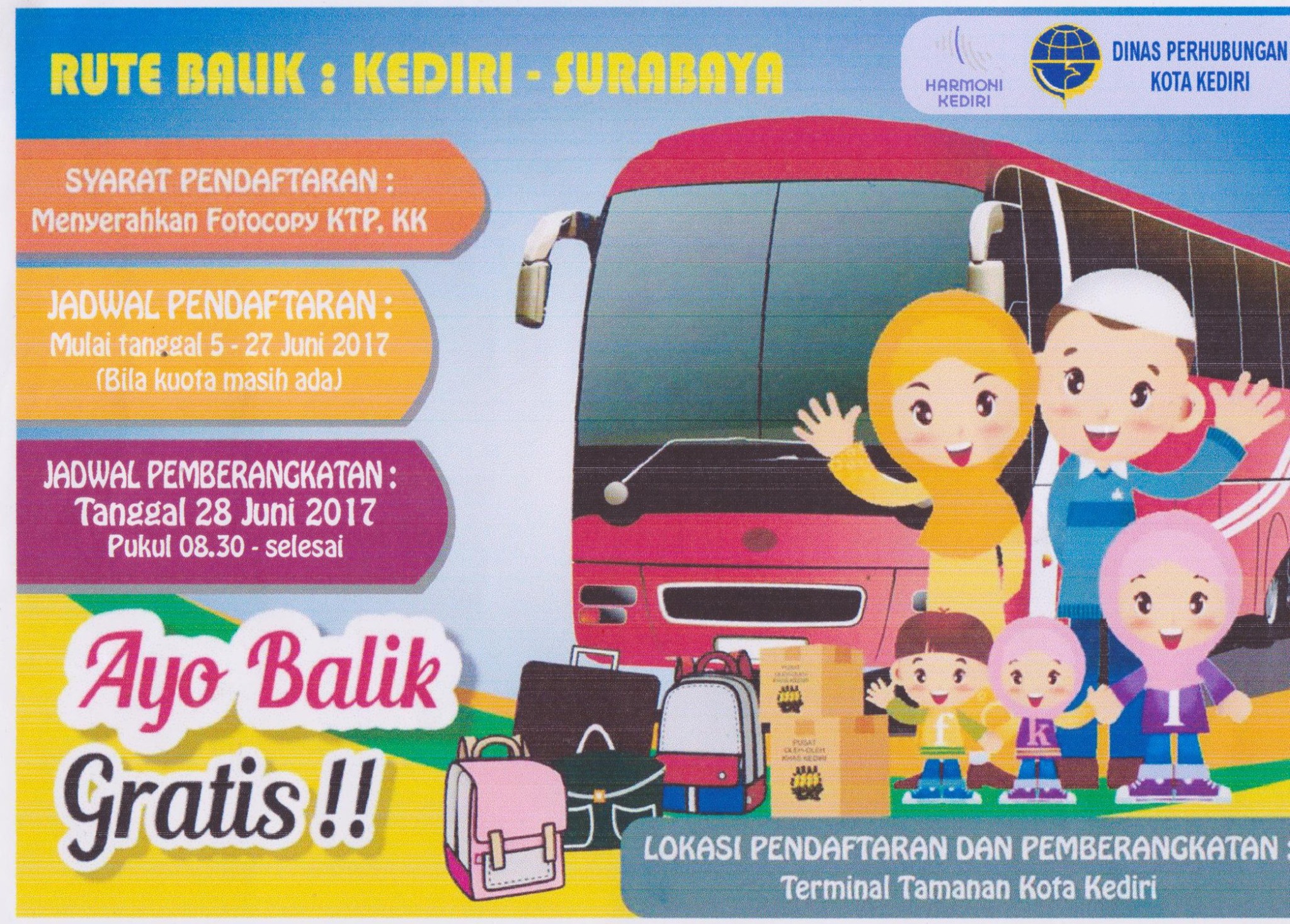 Balik Gratis Tahun 2017 , program Dishub Kota Kediri untuk mengurangi kemacetan pada saat hari raya idul fitri yang dimana menggratiskan naik bus bagi para pemudik untuk tujuan Kediri-Surabaya.